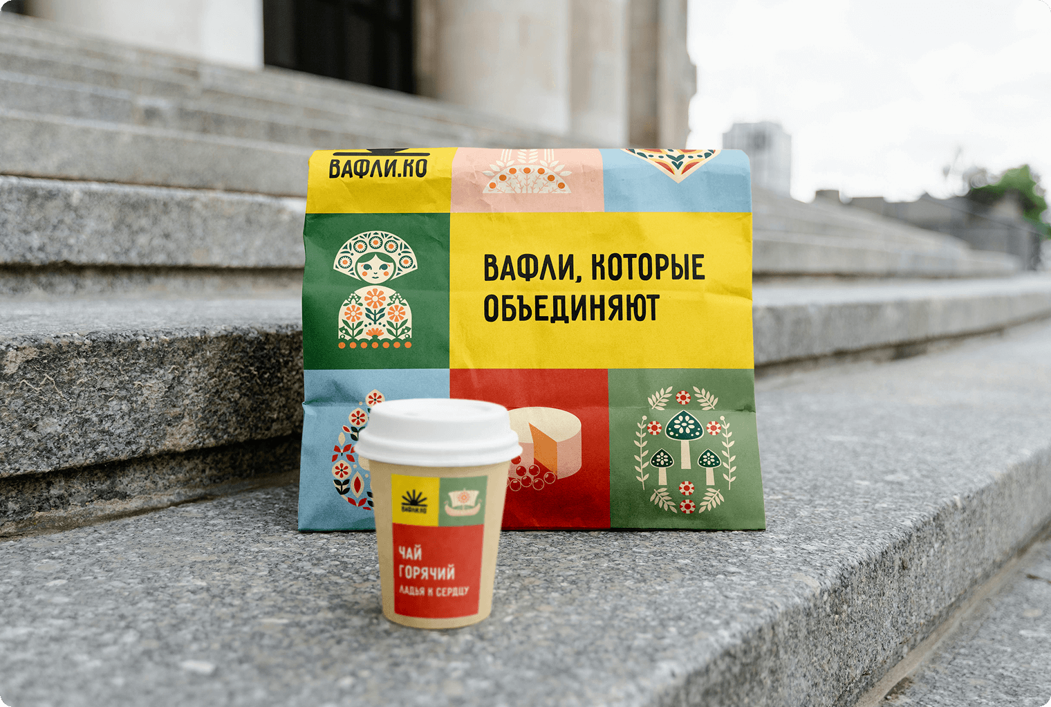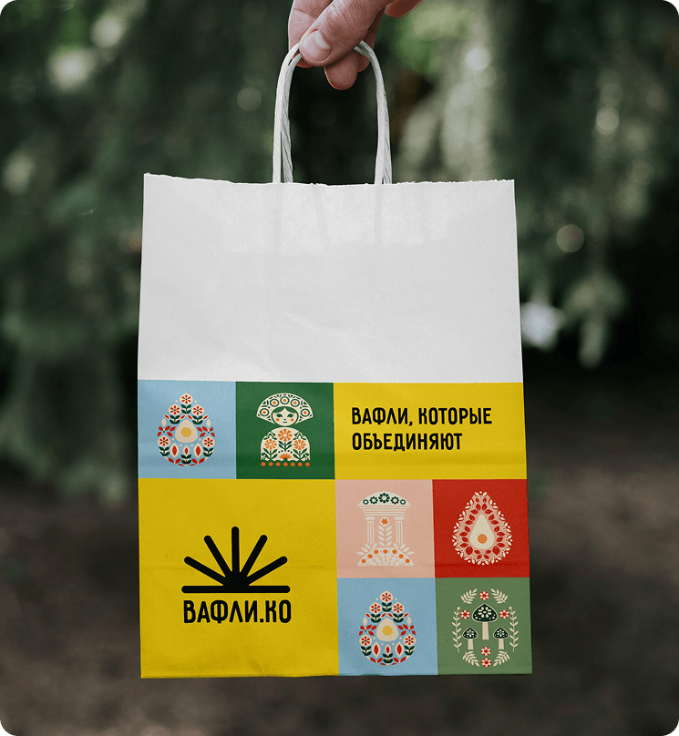В итоге мы получили яркий, тёплый и визуально узнаваемый стиль. Он не копирует готовые решения, не уходит в лубок, но чётко встроен в контекст города. Бренд «Вафлико» уже узнают на улицах, у него формируется своя аудитория, а визуальный язык успешно реализован на ключевых носителях — от меню и оформления фудтрака до упаковки и фирменной коммуникации. Айдентика заложена как масштабируемая система, готовая к развитию и росту бренда в будущем.