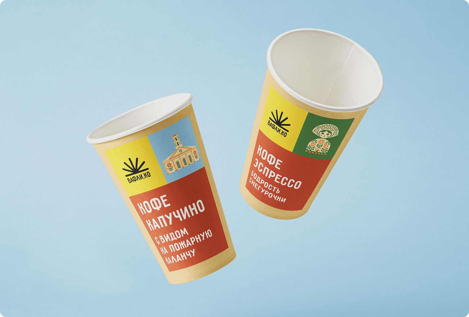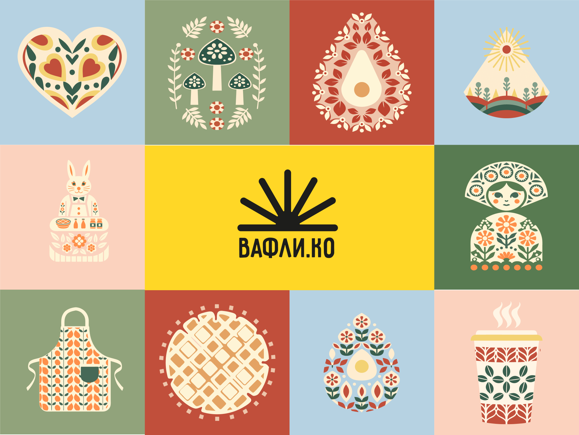 Логотип построен на геометрии площади, обобщённой до характерной и легко считываемой формы. Основной цвет — яркий жёлтый, отсылающий как к цвету вафель, так и к костромской пожарной каланче. Остальная палитра подбиралась в контраст к жёлтому, но с сохранением мягкости и чистоты. Это визуально аппетитные, но не приторные сочетания. Шрифтовая часть построена на гарнитуре Pribambas — наивной, немного «ручной» и хорошо дополняющей общий характер бренда.
