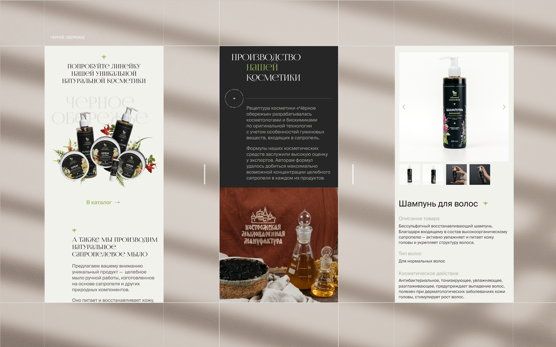При создании дизайна мы отталкивались от визуального стиля сайта Костромской мыловаренной мануфактуры, но привнесли в этот проект свою уникальность. В оформлении использованы землистые оттенки и текстуры природных материалов, однако ключевым отличием стало преобладание глубокого тёмного фона, подчёркивающего премиальность и таинственность бренда. Акцентным цветом стал природный зелёный, символизирующий натуральность и гармонию с окружающей средой.