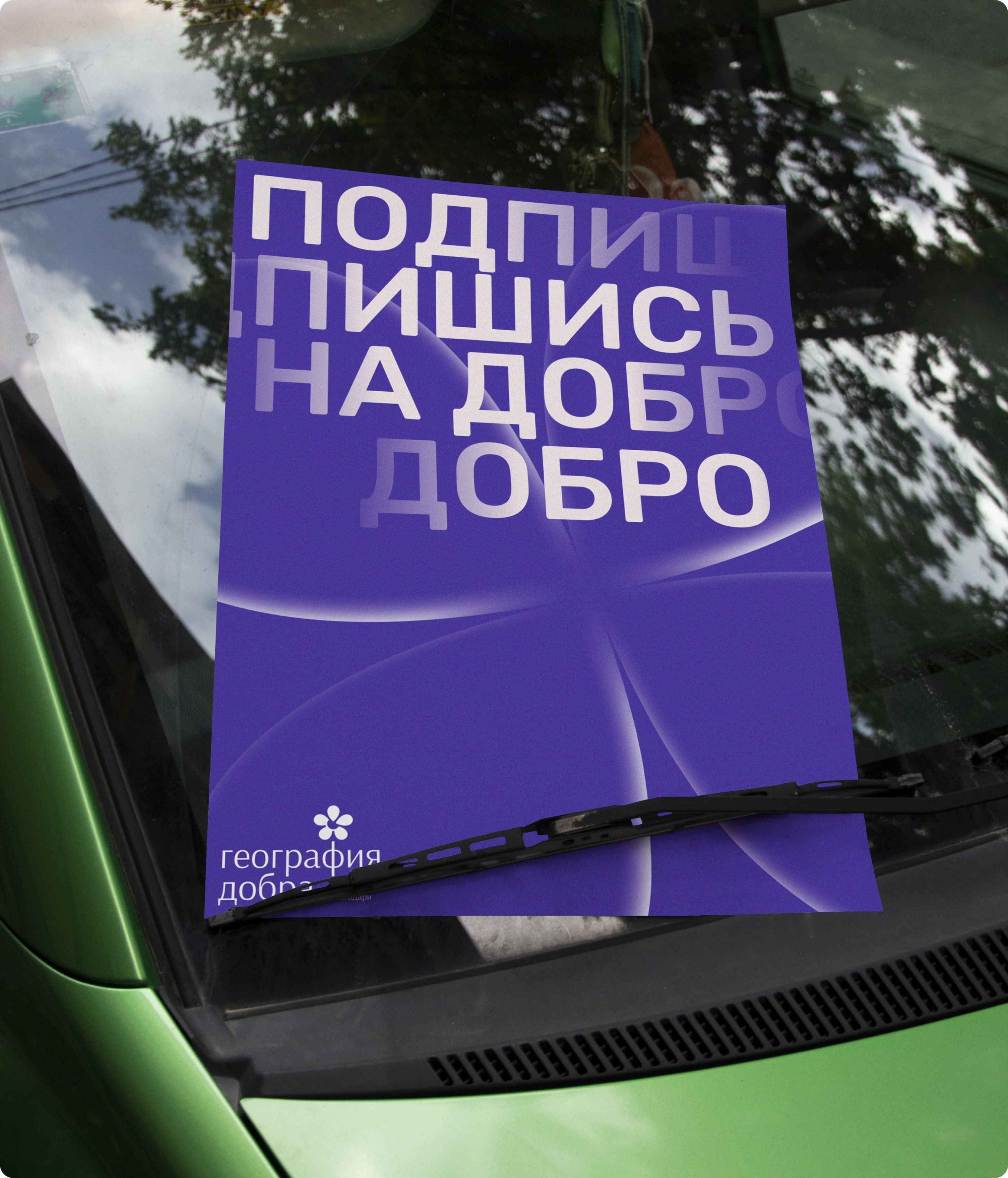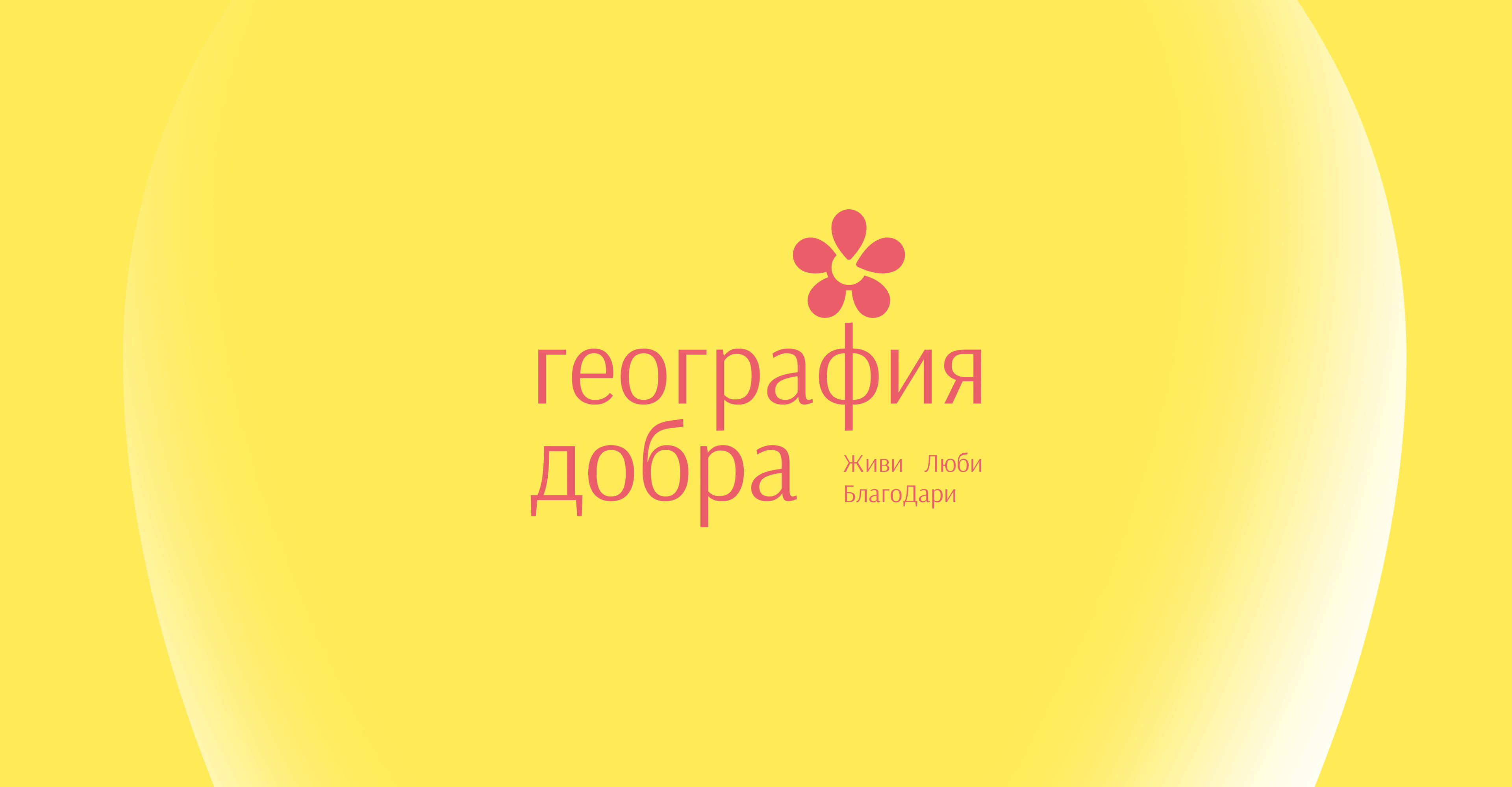 В качестве главного стиле образующего элемента мы использовали силуэт лепестка, который при дублировании образует цветочек или другие интересные образы. Все эти образы ассоциируются с добротой — цветочек, Солнце, детская ветряная мельница. А ещё сам по себе силуэт лепестка напоминает геометку, тем самым отсылая нас к прошлому логотипу фонда.