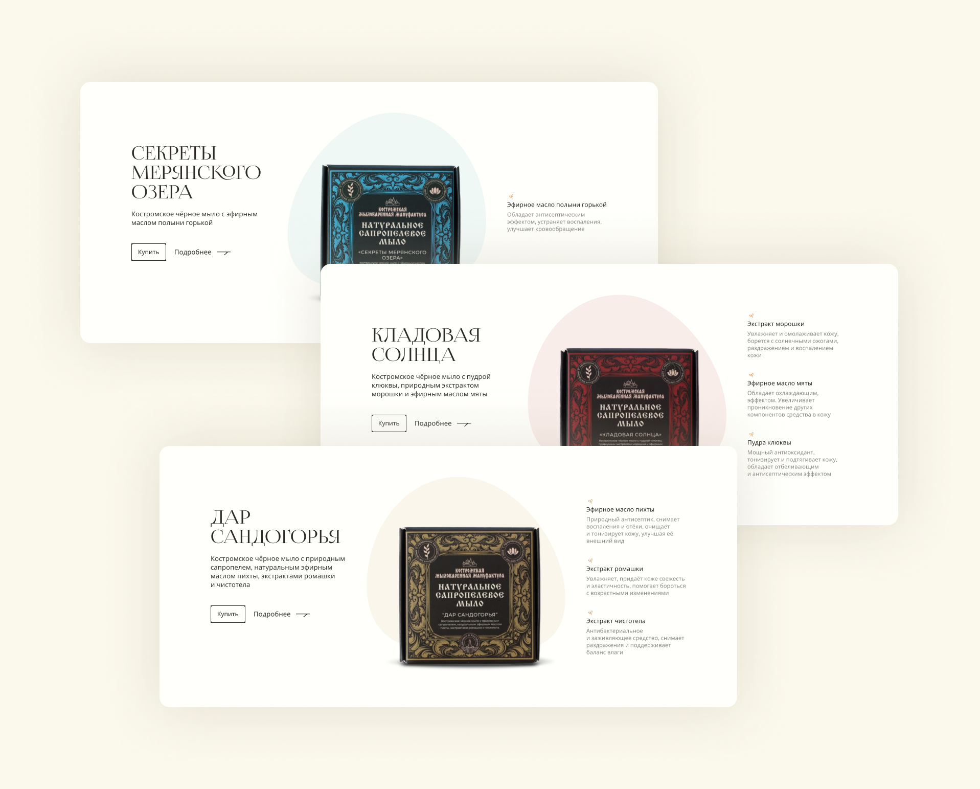 Задача проекта заключалась в том, чтобы не только презентовать мыло как продукт, но и показать его уникальные свойства, обусловленные использованием сапропеля — целебного природного ингредиента. Важно было акцентировать внимание на ручном подходе к производству, экологичности компонентов и традициях костромского ремесла.