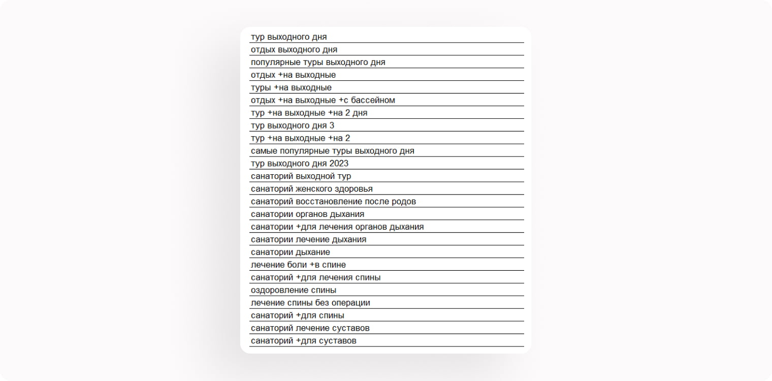 Для запуска рекламы в РСЯ не было необходимости собирать широкую семантику. Мы пересобрали ключевые фразы, которые заказчик использовал ранее: удалили неэффективные и низкочастотные запросы. Оставили только те слова и фразы, которые максимально соответствовали как тематике санаторного лечения, так и отдыха на выходные.