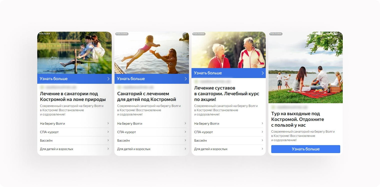 Мы выделили регионы с наибольшей вероятностью конверсии: Москву, Ярославль, Иваново и Кострому. В объявлениях делали акцент на местоположении санатория. Это привлекало аудиторию, которая рассматривала для себя возможность отдыха в новом месте, но недалеко от дома.