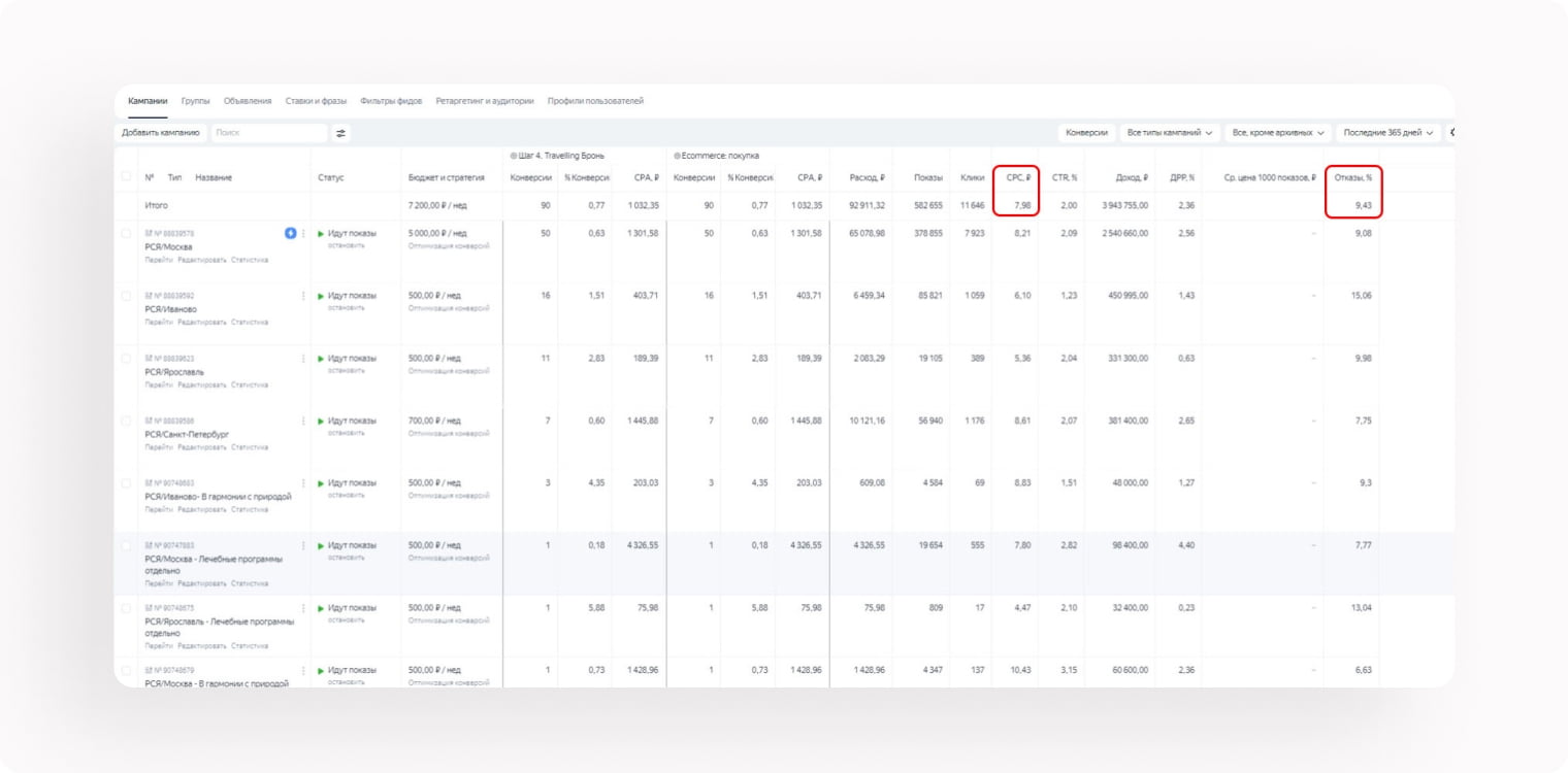 В течение всего времени показа объявлений мы оптимизировали кампании, добавляли новые креативы, минусовали неконверсионные площадки, тестировали новые заголовки и тексты.