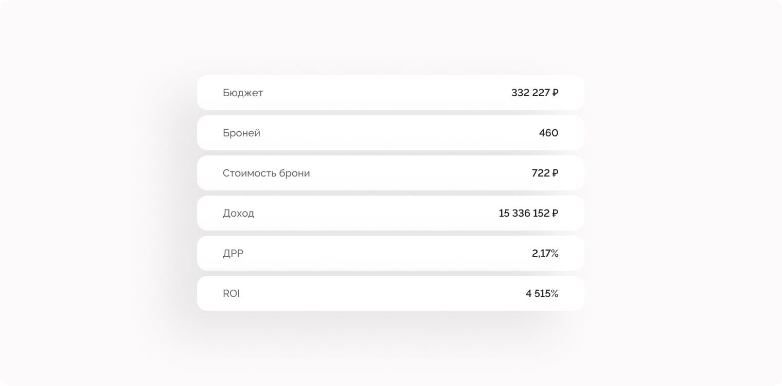 Для действительно эффективной работы рекламных кампаний нужно было понимание экономической составляющей проекта. Сколько реклама получила кликов и привела лидов, а сколько в итоге было оплачено броней и какой оказалась доля рекламных расходов.