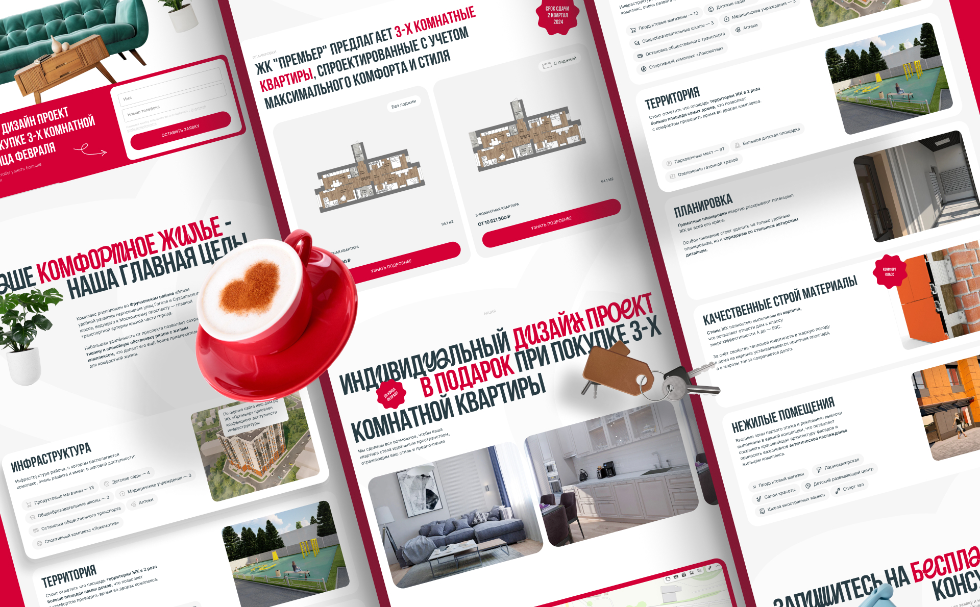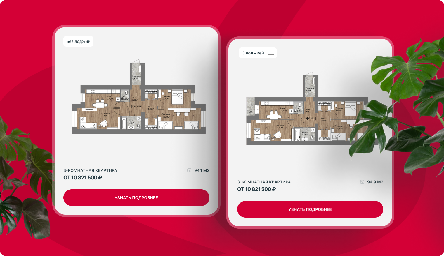 Самый важный раздел лендинга — карточки с квартирами. Не перегружая пользователя дополнительной информацией, они позволяют сконцентрироваться на ключевых параметрах для выбора.